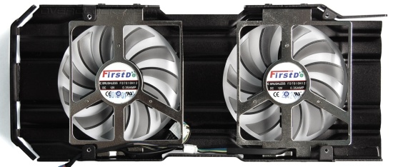Сверху на радиатор устанавливается кожух с двумя вентиляторами типоразмера 80 мм с маркировкой FD7010H12. Вентиляторы одинаковой конструкции, а не разной, как у старых представителей ASUS.