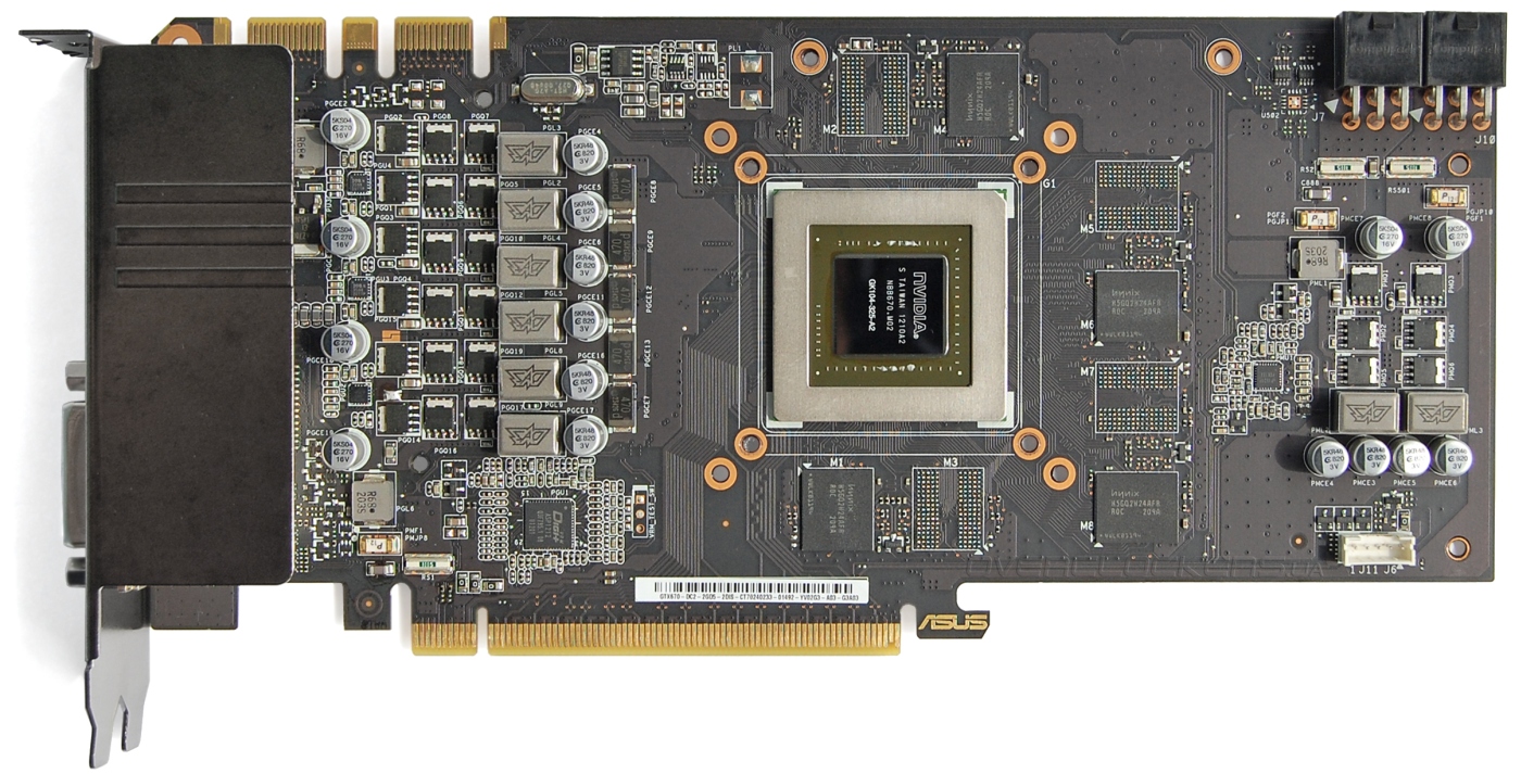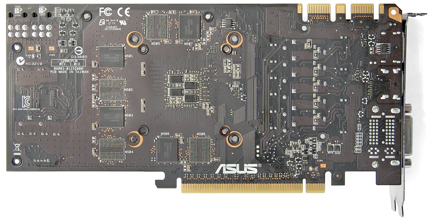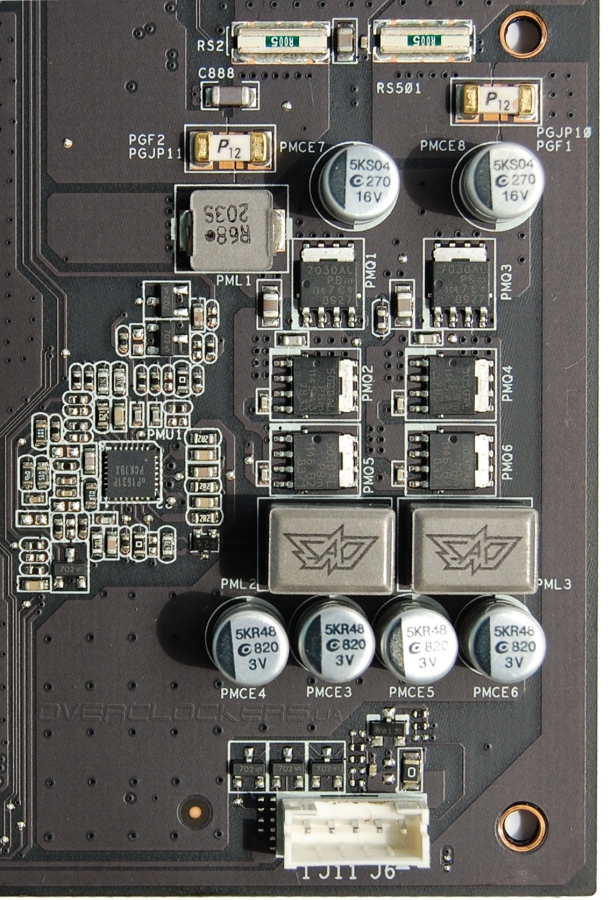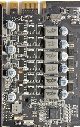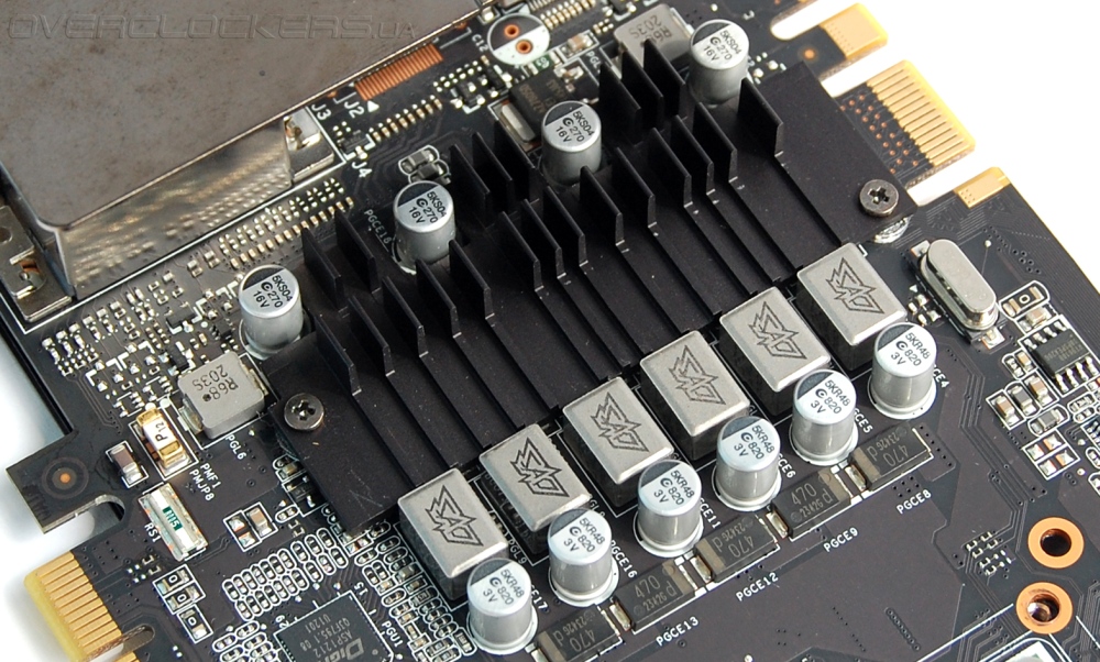 Печатная плата отдаленно напоминает референсную. Только в данном случае мы имеем расширенный во всех смыслах вариант. Вместо «огрызка» полноценная плата длиной 23,5 сантиметра (общий размер видеокарты 27 см). Микросхемы памяти расположены с двух сторон. Использована более качественная элементная база. Графический процессор запитан от 8-фазного преобразователя напряжения, память GDDR5 — от двухфазного. Есть еще и такие мелочи, как большее число танталовых конденсаторов под чипом, что лишний раз подтверждает превосходство данной платы над стандартной версией.