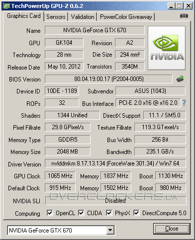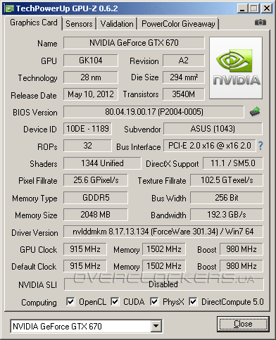 - драйвер GeForce GTX 670: NVIDIA GeForce 301.34.