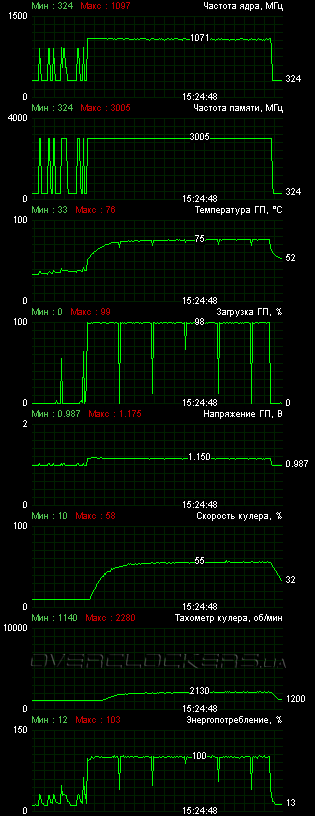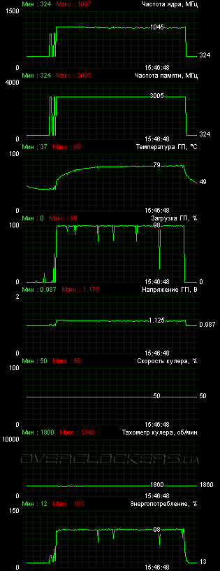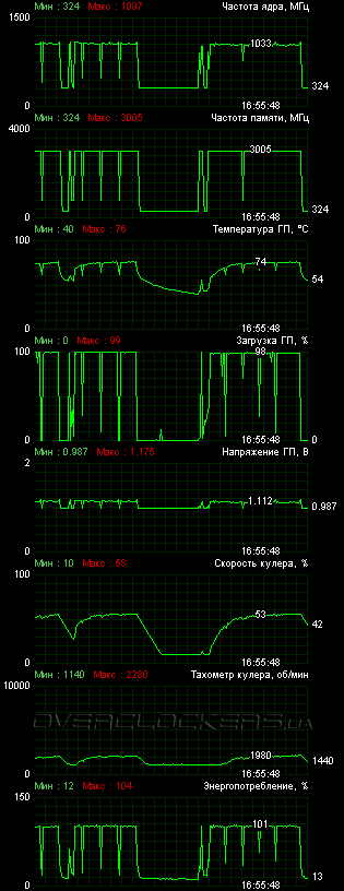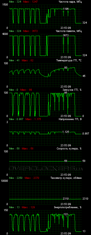 Ну и самое главное, что при таком разгоне карта смогла работать на умеренных оборотах вентиляторов. При скорости ниже 2000 об/мин тяжелые тесты не удавалось пройти — сказывался перегрев. А вот при 58% (2280—2340 об/мин) были пройдены все тесты. В Crysis: Warhead пиковая температура достигала 80 °C.
