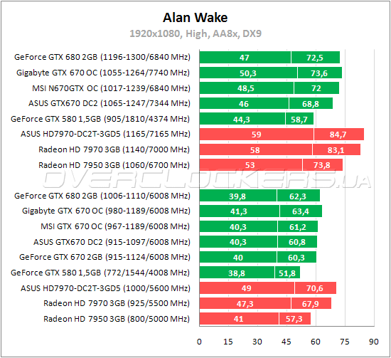 В Alan Wake решения NVIDIA соперничают лишь с Radeon HD 7950. Мизерная разница между GeForce GTX 670 и GeForce GTX 680 связана, скорее всего, с более новым драйвером у младшей карты. В номинале ASUS быстрее референса от MSI, при разгоне уступает только Gigabyte.