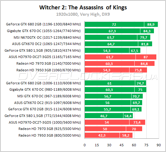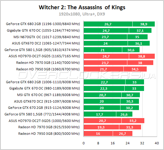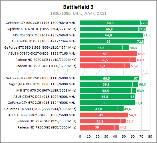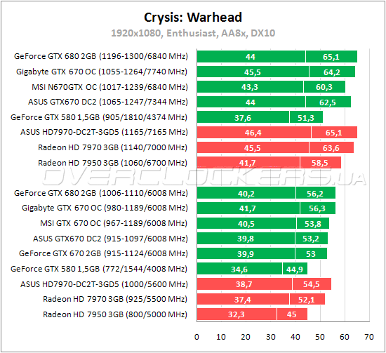 В Warhead обычный GeForce GTX 670 вместе с ASUS уступают Radeon HD 7970 по среднему fps, но чуть лучше по минимальному показателю. При разгоне ASUS уверенно обходит форсированный Radeon HD 7950 и уступает Radeon HD 7970. Повышение частот дает прирост производительности в 17,5% по среднему fps и 10% по минимальному показателю.