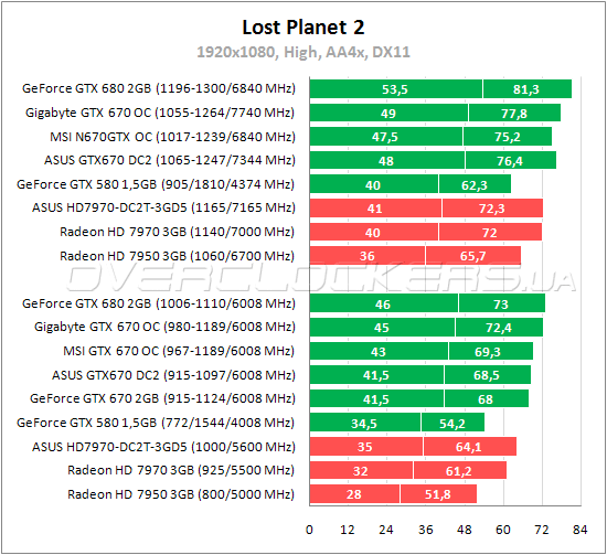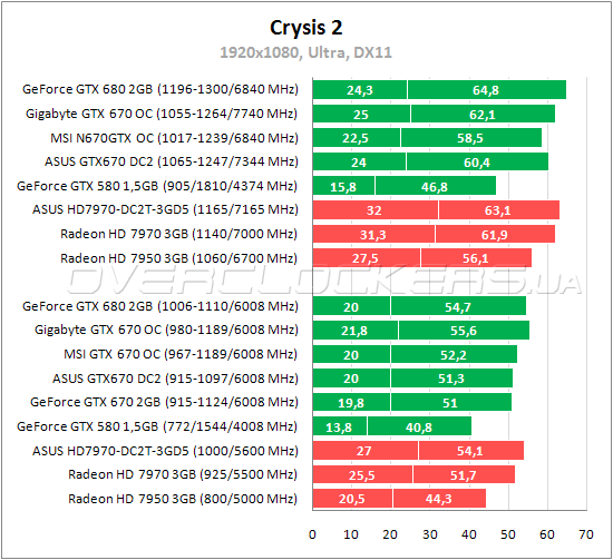 В Crysis 2 представители NVIDIA демонстрируют высокий средний fps, но проигрывают по минимальному показателю. По этому параметру GTX670-DC2-2GD5 чуть уступает Radeon HD 7950, хотя средняя частота кадров почти как у Radeon HD 7970. Прирост ускоряет карту на 18% и 20% по минимальному/среднему показателю.
