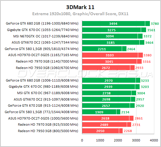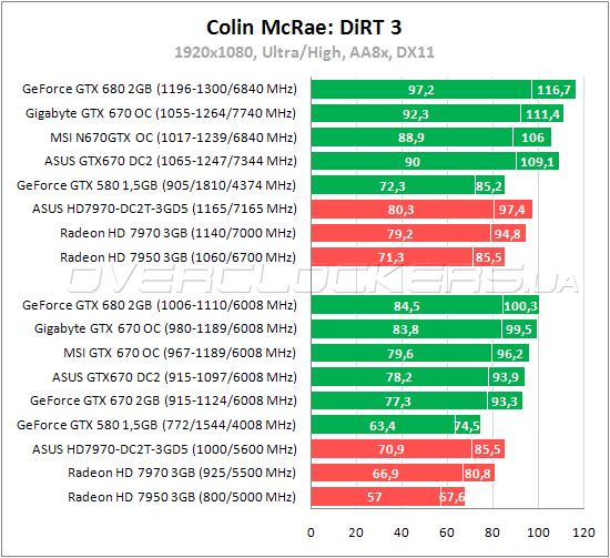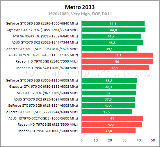 Представители AMD берут реванш в Metro 2033. В этом тесте простые GeForce GTX 670 чуть уступают Radeon HD 7950 — 1,3%. При разгоне ASUS GTX 670 демонстрирует уровень производительности ASUS HD7970-DC2T-3GD5 в номинале, обгоняя его на доли процента.