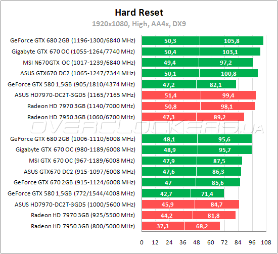 И в Hard Reset у видеокарт NVIDIA тоже очень сильные позиции. ASUS GTX 670 снова обгоняет товарища, ASUS HD7970-DC2T-3GD5, но в этот раз с минимальным отрывом. При разгоне у них устанавливается примерный паритет — один чуть лучше по минимальному показателю, другой по среднему. Вот только Radeon работает на пределе возможностей в шумном режиме, а GeForce при умеренных оборотах обдувающих вентиляторов.
