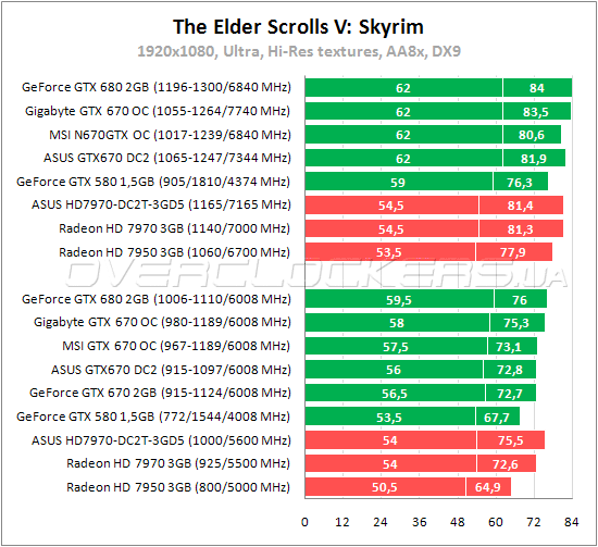 Рассмотрение результатов в Skyrim мы традиционно начинаем с комментарием по процессорозависимости. В данном случае результаты явно уперлись в мощность процессора, поэтому и частота кадров на разных картах отличается слабо, а разгон дает небольшой прирост. Но примечательно, что даже в таких условиях GeForce демонстрируют преимущество над конкурентами, особенно по минимальному fps. По последнему параметру GeForce GTX 670 лучше Radeon HD 7970. Последние вообще не могут перешагнуть рубеж в 54 fps, хотя зеленым это удается.