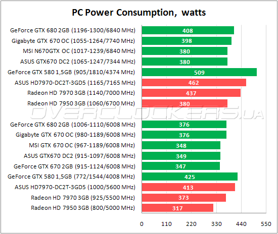 Никаких сюрпризов в плане энергопотребления ASUS GTX670-DC2-2GD5 не преподнес. Видеоадаптер почти не отличается от референсной версии GeForce GTX 670. Обе карты экономичнее Radeon HD 7970, но потребляют больше Radeon HD 7950. Аппетиты разогнанных GeForce GTX 670 меньше запросов старших Tahiti на высоких частотах.