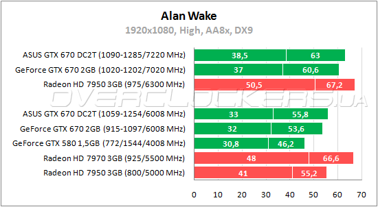 В Alan Wake лидируют решения AMD. ASUS TOP всего на 3—4% обходит референс. С разгоном видеоадаптер нагоняет и обгоняет Radeon HD 7950 по среднему fps, но проигрывает по минимальному.