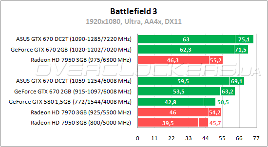 Battlefield 3 в отличие от предыдущей игры предпочитает видеокарты NVIDIA. ASUS GTX670-DC2T-2GD5 примерно на 10% производительнее референсного GTX 670 и на 37—39% лучше старого флагмана GTX 580. Radeon HD 7950 слабее на 51%, а Radeon HD 7970 на 28—29%. При разгоне GTX670-DC2T-2GD5 тоже нет равных.