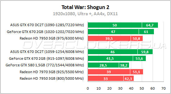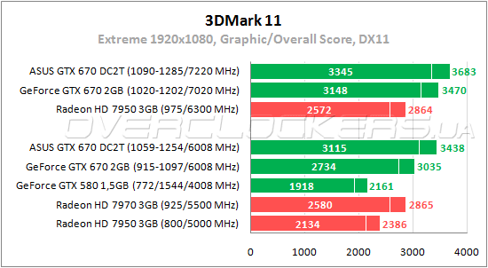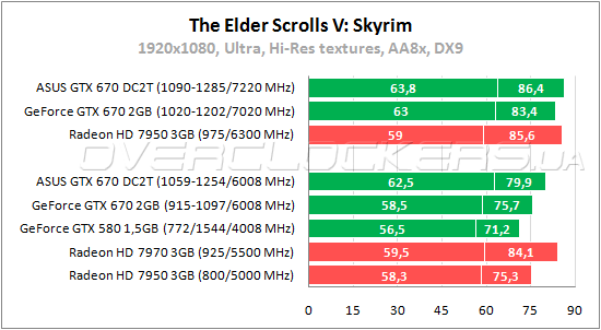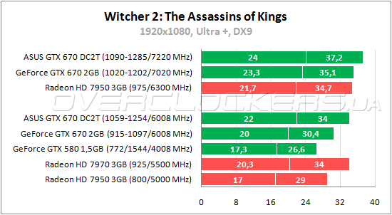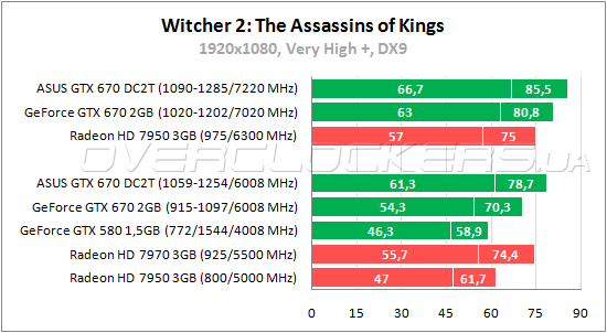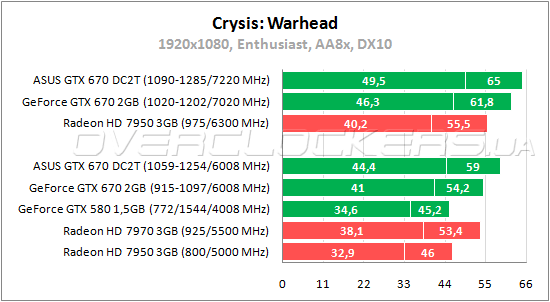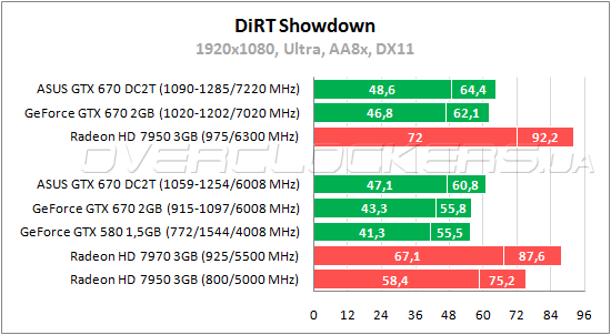 Radeon HD 7970 проигрывает даже простому GeForce GTX 670. С ASUS разница достигает 17—18%. Между GTX670-DC2T-2GD5 и референсным Kepler разница в 11%. При разгоне ASUS доводит преимущество над референсом до 20,5%.