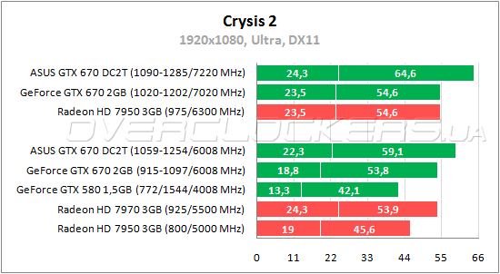 В Crysis 2 по среднеигровой частоте кадров лидирует ASUS, а вот по минимальному fps лучше красный флагман. Разгон поднимает производительность еще на 9%.