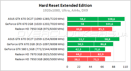 В игре Hard Reset ситуация меняется на противоположную. ASUS уверенно лидирует, обгоняя собрата от Gainward на 6—14%, а Radeon HD 7970 на 19—21%.