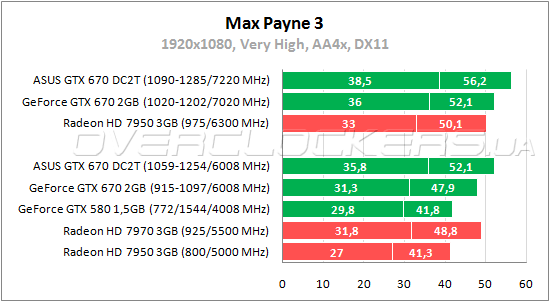 При стандартных частотах в Max Payne 3 обычный GeForce GTX 670 чуть-чуть проигрывает Radeon HD 7970, но благодаря повышенной частоте ядра GTX670-DC2T-2GD5 уже оказывается впереди.