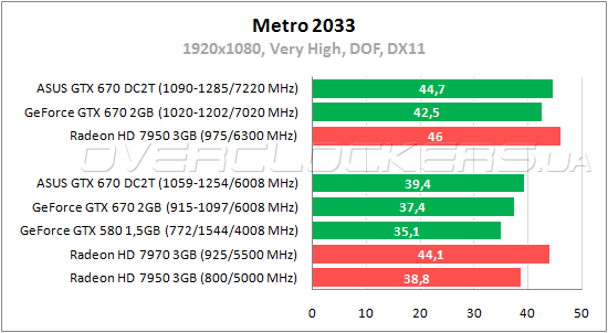 В Metro 2033 Radeon HD 7950 немного обгоняет простой GeForce GTX 670, но уступает TOP-версии ASUS. При разгоне участников младший представитель AMD оказывается быстрее соперников, и это с учетом низкого частотного потенциала данного экземпляра.