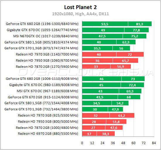 GeForce GTX 680 в данном тесте лидирует, но Gigabyte GV-N670OC-2GD наступает на пятки. Radeon HD 7970 слабее на 40% по минимальному fps и на 18% по среднему. Разгон дает прирост в 7—9%.
