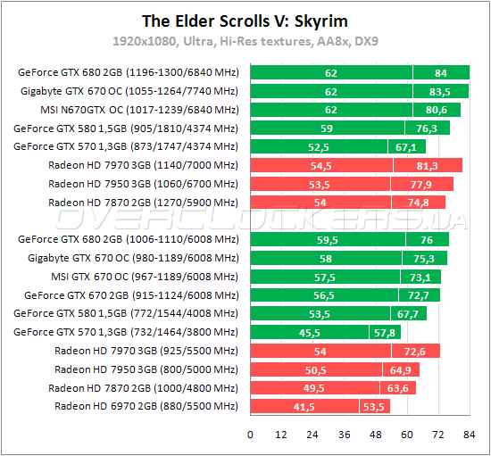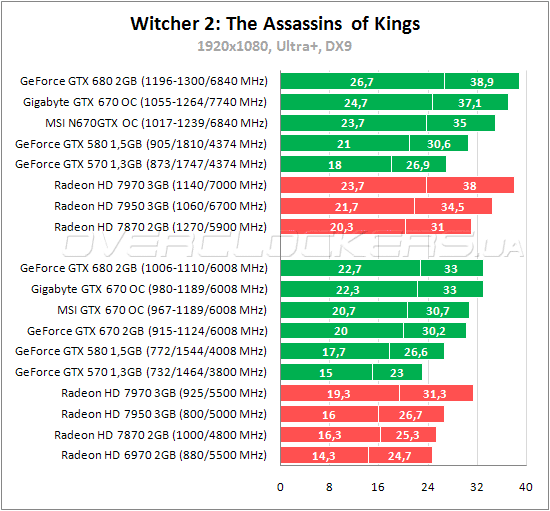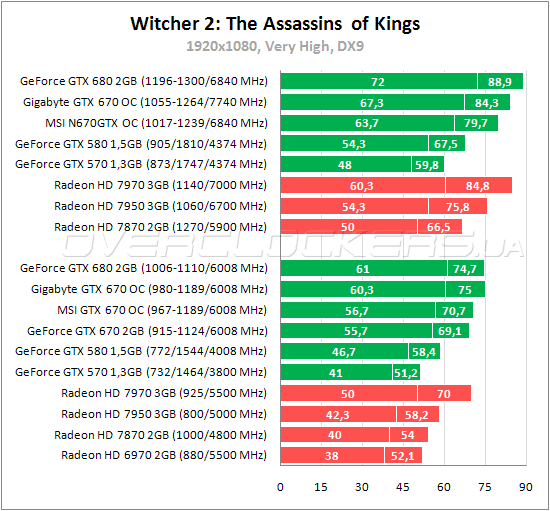 Во втором «Ведьмаке» ускоренный GTX 670 от Gigabyte на доли процента обходит по среднему fps флагманский ускоритель NVIDIA, а по минимальному проигрывает 1%.