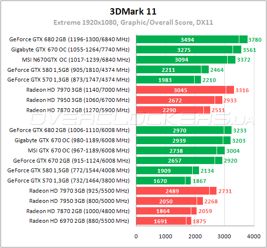 В этом тесте отставание Gigabyte GTX 670 от старшей карты укладывается в 1%. Преимущество над Radeon HD 7970 составляет 18%. Разгон повышает результат на 11%.