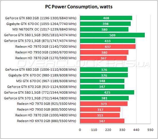 Замеры потребляемой мощности производились в восьми приложениях. Для Radeon HD 7970 напряжение в номинале и при разгоне — 1,17 В и 1,218 В; для Radeon HD 7950 — 0,993 В и 1,068 В; для Radeon HD 7870 — 1,15 В и 1,218 В. Референсный GeForce GTX 580 работал на 1,0 В (1,012 В в Crysis 2) в номинале и 1,113 В при разгоне. GeForce GTX 570 работал при напряжении 0,975 В в номинале и 1,05 В при разгоне. Напряжение видеокарт на базе GK104 варьируется в зависимости от частот, которые повышаются и снижаются в зависимости от потребляемой мощности.