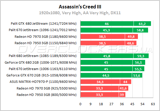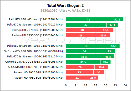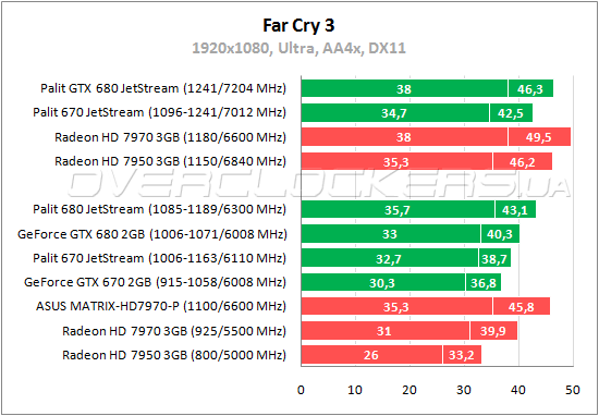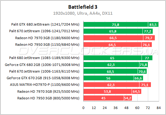 А вот в данной игре GeForce возвращают лидерство. Простой GeForce GTX 670 обходит Radeon HD 7970 с отрывом 15–26%. В этот раз даже ASUS Matrix слабее младшего представителя NVIDIA. GTX 670 JetStream в номинале чуть не дотягивает до референсного GeForce GTX 680, а при разгоне немного уступает своему собрату GTX 680 JetStream, работающему на номинальных частотах.