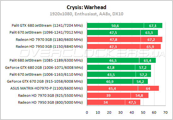 В Warhead референсный GeForce GTX 670 лучше Radeon HD 7970 по минимальному fps, а Palit JetStream выигрывает у этого соперника 4–12%. Даже обычный GeForce GTX 680 чуть уступает в номинале Palit, но только по минимальному fps и менее 2%. В номинале между Radeon HD 7950 и GeForce GTX 670 разница 14–20% в пользу представителя NVIDIA, а при разгоне Radeon выходит вперед с преимуществом в 4% по среднему fps.