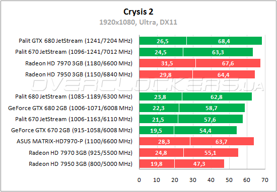 В Crysis 2 между GeForce GTX 670 и Radeon HD 7950 паритет по минимальному fps при преимуществе первого по среднему показателю в 15%. Palit JetStream удается по средней частоте кадров немного обойти Radeon HD 7970, но по минимальному показателю он все равно хуже. При разгоне представители AMD демонстрирует уверенно лучшие показатели по минимальному fps. На повышенных частотах GTX 670 JetStream немного обходит работающий в номинале GTX 680 JetStream.