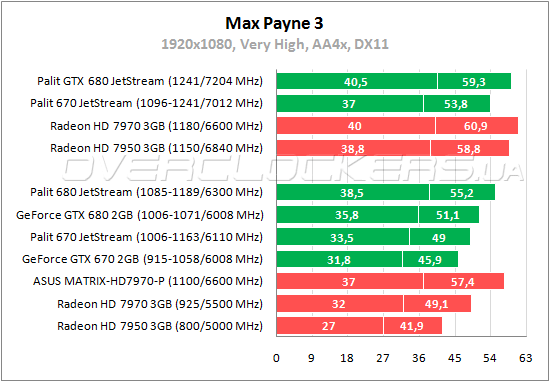 GeForce GTX 670 лучше Radeon HD 7950 на 18% по минимальному fps и на 10% среднему показателю в Max Payne 3. Palit демонстрирует уровень производительности Radeon HD 7970 и даже на 5% обходит конкурента по минимальному параметру. При разгоне младший GeForce уже уступает представителям AMD на повышенных частотах.
