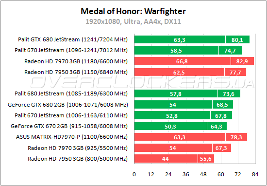 Разница между GeForce GTX 670 и GeForce GTX 680 в Medal of Honor не превышает 7%. Младшая видеокарта быстрее Radeon HD 7950 на 14–16%. Palit снова держится на уровне Radeon HD 7970, в этот раз не дотягивая лишь 2% по минимальному fps. При разгоне мы наблюдаем привычную ситуацию, когда Radeon HD 7950 оттесняет на второй план ускоренный GeForce GTX 670.