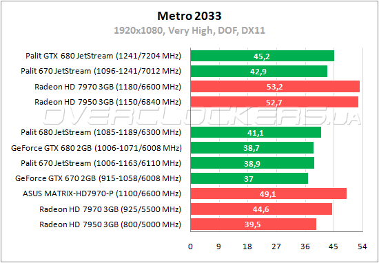 При активном Depth of Field в Metro 2033 между GeForce GTX 670 и GeForce GTX 680 наблюдается мизерная разница в результатах — сказывается одинаковая пропускная способность шины памяти и ее частота. В номинале Radeon HD 7950 производительнее младшего GeForce почти на 7%, при разгоне — на 23%.