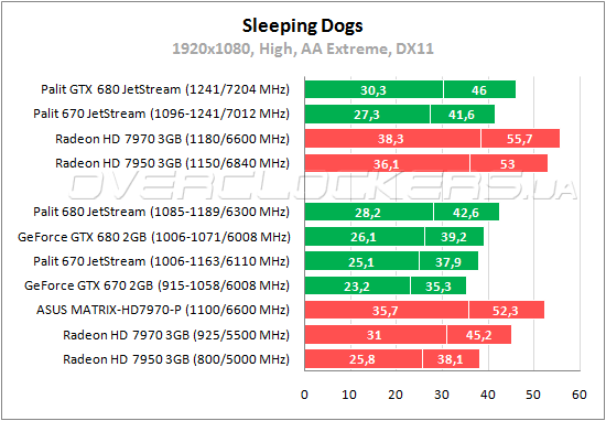 В Sleeping Dogs видеокарты AMD возвращают лидерство. Radeon HD 7950 обходит обычный GeForce GTX 670 и ускоренную версию от Palit, хотя с последним разница скромная — менее 3%. При разгоне представители красных укрепляют свои позиции.