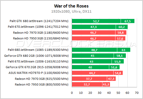 GeForce GTX 670 вновь удается обойти Radeon HD 7970, в этот раз на 6–9%. Производительность ASUS Matrix и Palit GTX 670 JetStream оказывается примерно на одном уровне. Отставание младшего Palit от GeForce GTX 680 почти 5%. При разгоне GeForce GTX 670 сохраняет преимущество над конкурентами AMD, хотя разница резко уменьшается до минимума.