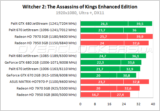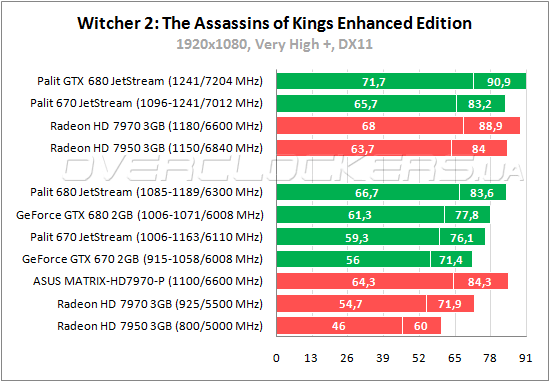 В обоих тестовых режимах второго «Ведьмака» GeForce GTX 670 оказывается лучше Radeon HD 7950, почти не уступая Radeon HD 7970. На повышенных частотах младший Palit демонстрирует уровень производительности ASUS Matrix.