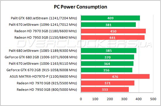 Энергопотребление обоих GeForce GTX 670 повыше чем у Radeon HD 7950. Зато в разгоне представители NVIDIA намного экономичнее ускоренных конкурентов.