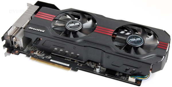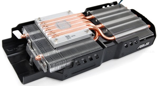 Для охлаждения используется кулер DirectCU II, который уже хорошо знаком нашим читателям по другим обзорам видеокарт ASUS. Пять тепловых трубок с технологией прямого контакта с чипом, двухсекционный тонкий радиатор и очень большие вентиляторы с реальным размером крыльчатки 92 мм (что фактически соответствует типоразмеру 100 мм). Уникальностью данной системы является использование вентиляторов толщиной 25 мм. Обычно другие производители устанавливают тонкие вентиляторы, а оставшееся пространство используют для увеличения площади радиатора. Подход ASUS противоположный, но такая система уже давно доказала свою эффективность.