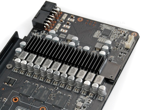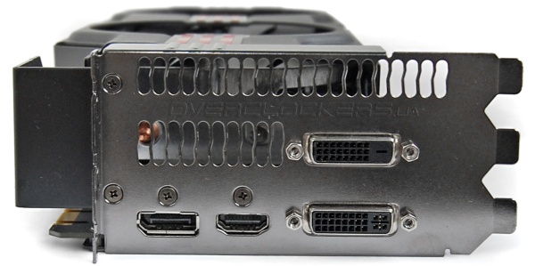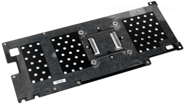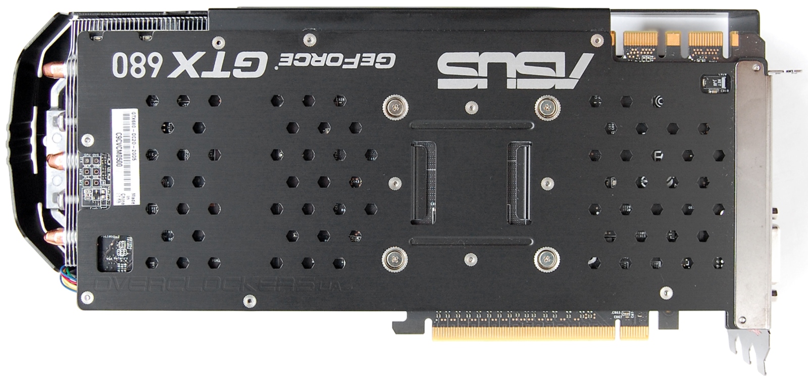 Задняя сторона закрыта металлической пластиной. Сбоку в текстолите видны несколько промаркированных отверстий. ASUS GTX680-DC2O-2GD5 поддерживает технологию VGA Hotwire, и при подключении карты через эти контакты на соответствующие линии материнских плати ASUS серии Republic of Gamers появляется возможность контроля и управления напряжением питания графического процессора и памяти.