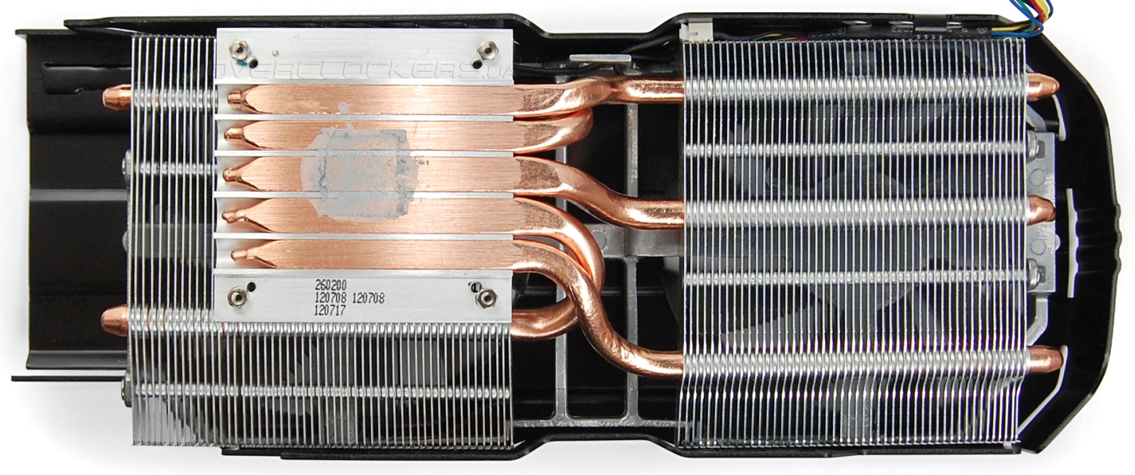 Радиатор так плотно сидел внутри металлического кожуха, что напрочь отказывался изыматься после выкручивания всех фиксирующих винтов. Мы не стали особо усердствовать из-за опасности повреждения радиатора. Если же вам интересны более детальные фотографии, их можно просмотреть в обзоре ASUS HD7970-DC2-3GD.