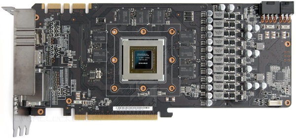 Никаких сюрпризов не преподносит и осмотр печатной платы. Дизайн полностью копирует ASUS GTX680-DC2T-2GD5. Восьмифазный преобразователь напряжения GPU под управлением контроллера DIGI+ ASP1212. Подсистема питания памяти реализована с использованием двух фаз.