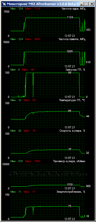 Реальная частота ядра стабильно держится на отметке 1124 МГц. Бенчмарк Crysis: Warhead при максимальном качестве графики прогрел GPU лишь до 66 °C. Скорость вращения вентиляторов едва превысила 1500 об/мин, шум был низкий.