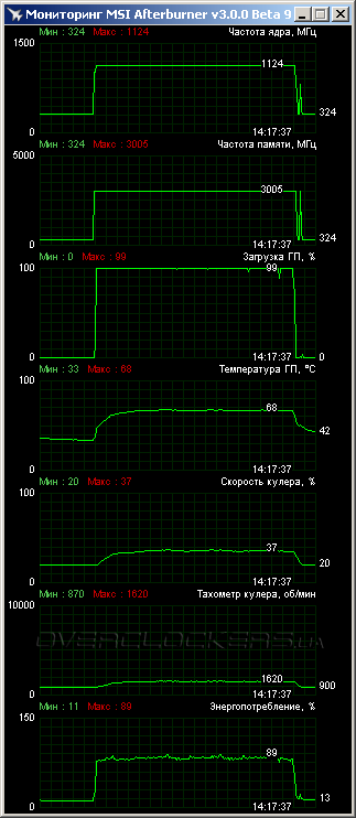 По итогам 12-минутного тестирования Unigine Valley benchmark пиковая температура не превысила 68 °C. Вентиляторы раскручивались уже до 1620 об/мин.