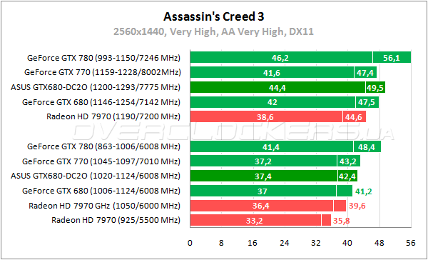 В Assassin’s Creed 3 наш герой почти не уступает GeForce GTX 770 в номинале и легко превосходит его при разгоне.