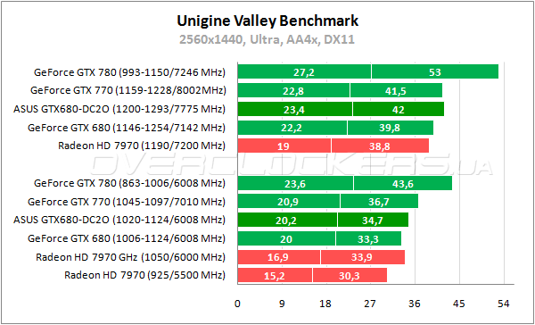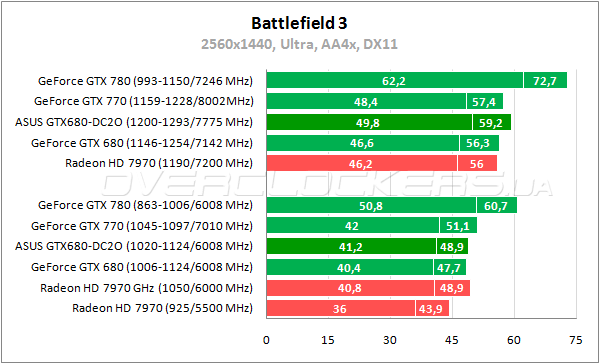 У ASUS средняя позиция между GeForce GTX 680 и GeForce GTX 770 в номинале и лучший результат при разгоне. При заводских частотах Radeon HD 7970 GHz Edition уступает 2% по средней частоте кадров и 20% по минимальному показателю. При разгоне конкурент уступает 8–23%.