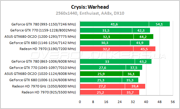 В Warhead мизерное преимущество над простым GeForce GTX 680. С повышением частот ASUS обходит ускоренный GeForce GTX 770 на 3–4%. На повышенных частотах ASUS нагоняет работающий в номинале GeForce GTX 780.
