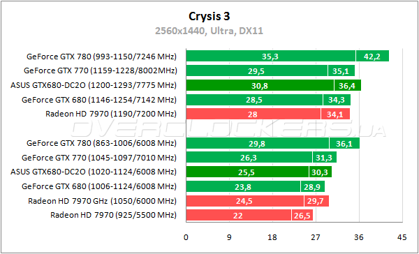 В Crysis 3 простой GeForce GTX 680 немного уступает Radeon HD 7970 GHz Edition, но ASUS GTX680-DC2O-2GD5 уже немного лучше. При разгоне наш герой сопоставим с работающим в номинале GeForce GTX 780, даже чуть быстрее.