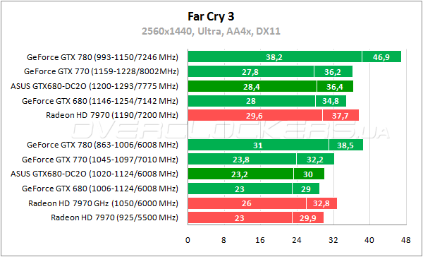 Традиционно скромное преимущество ASUS над простым собратом в Far Cry 3. При разгоне в этот раз они тоже слабо отличаются. Потягаться силами со старшим GeForce GTX 780 нашему герою уже не удается.