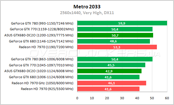 Расстановки сил в номинале вполне типичная. А вот при разгоне наш ASUS демонстрирует в Metro 2033 мизерное преимущество на GeForce GTX 770.