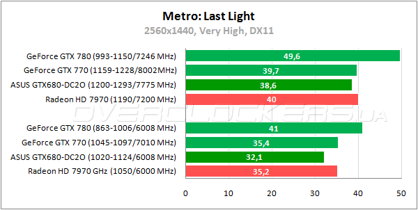 В Last Light позиции ASUS относительно GeForce GTX 770 еще хуже. Совершенно неожиданно наш герой при разгоне даже уступает новичку, хотя по частотам преимущество на стороне старого флагмана. Причина в более новом видеодрайвере, который и обеспечивает лучшие результаты GeForce GTX 770.