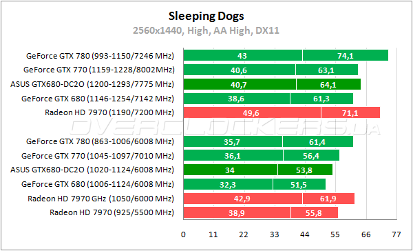 Совершенно мизерная разница между разогнанными ASUS и GeForce GTX 770 Sleeping Dogs. Возможно, тут тоже сыграл свою роль новый видеодрайвер у последнего.