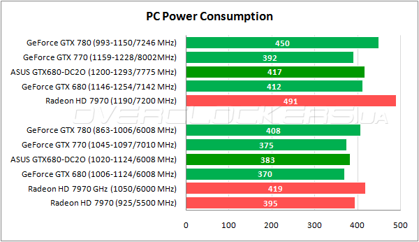 Система с ASUS потребляет больше ватт, чем конфигурации с обычным GeForce GTX 680. Результат вполне закономерный. С учетом хорошего разгонного потенциала это говорит об изначально повышенном напряжении. Но ASUS все равно оказывается экономичнее Radeon.