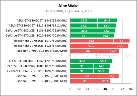 Начнем с результатов в Alan Wake. Эта игра лучше всего себя чувствует на видеокартах AMD. Прошлые тестирования показали значительную зависимость производительности в ней от пропускной способности памяти. И новые данные это только подтверждают. ASUS при одинаковой частоте памяти с референсом в номинале по среднему fps выигрывает лишь 7%, а по минимальному разница и вовсе пару процентов. И даже при разгоне ASUS не может обойти товарища по последнему параметру, у которого частота памяти выше. Конкурировать с Radeon HD 7970 в данной игре оба GeForce GTX 680 не могут.
