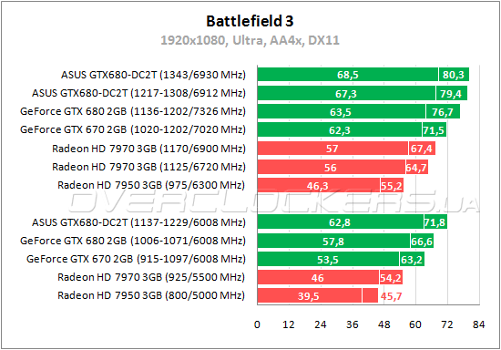 В Battlefield 3 рассматриваемый ASUS демонстрирует преимущество над простым GeForce GTX 680 в 8—9% и на 32—43% обгоняет Radeon HD 7970 (максимальная разница по минимальному fps). Если сравнить конкурентов при разгоне с умеренным уровнем шума, то ASUS при 1217—1308/6912 МГц быстрее Radeon HD 7970 1125/6720 МГц на 20—23%.