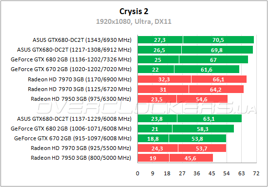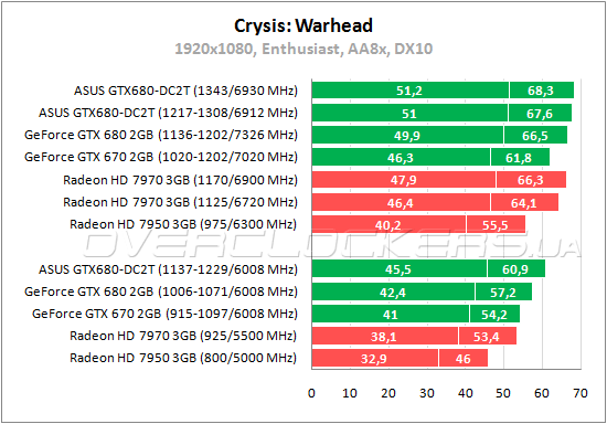 В Crysis: Warhead тоже лидируют видеокарты NVIDIA, но уже с меньшим преимуществом. Разница между ASUS GTX680-DC2T-2GD5 и референсным GTX 680 не более 7%. Radeon HD 7970 в данном тесте слабее на 14—19%. При разгоне с умеренным уровня шума разница между этими конкурентами уменьшается до 5—10%. Но даже при максимальном разгоне старший Radeon эти 5—10% не наверстывает.